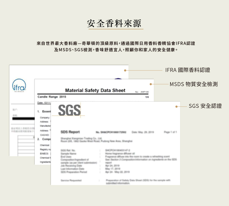 來自世界前三大香料廠的頂級原料,通過國際日用香料香精協會IFRA認證及MSDS檢測,不只香味舒適宜人,還照顧你和家人的安全健康。