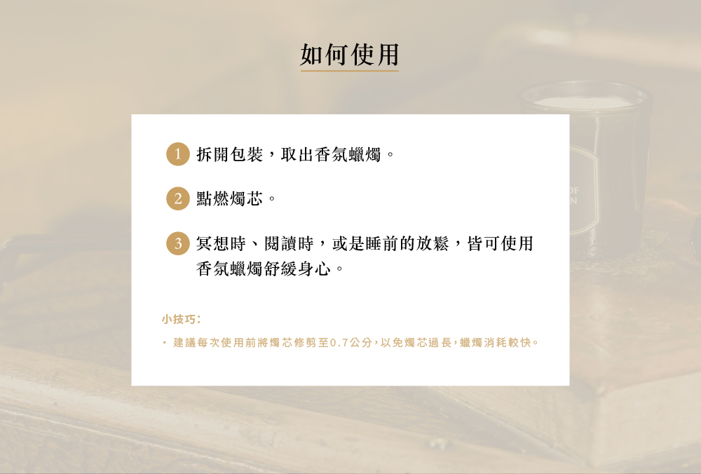 3. 使用時,請將香氛蠟燭置於平穩表面,勿使蠟燭瓶身傾斜。